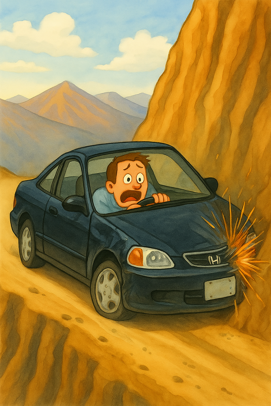 I reached out and folded in the driver’s mirror, edged left, and immediately heard plastic and metal scraping against rock. I almost puked. Putting it in park, I panicked and began to climb over to the passenger seat. I was begrudging myself those bad food choices now, fully convinced that my shifting body weight was going to send me to my doom.